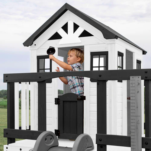 Raise the bar on backyard fun with the Sweetwater Heights Playhouse by Backyard Discovery. This elevated outdoor playhouse combines stylish charm with exciting play features, while being perfectly sized for any outdoor space. Kids will love exploring their very own clubhouse, complete with a wrap-around deck, wide step ladder, and wave slide. Inside this charming wooden playhouse, an interactive play kitchen inspires creativity with its toy stovetop, battery-powered appliances, built-in sink, and other accessories. The adorable working door and large windows allow plenty of natural sunlight and fresh air while making it easy to supervise playtime activities. Children of various ages can safely access their elevated retreat using the sturdy entry ladder with wide-rung steps. Make lasting memories by tracking your little ones’ growth with the attached measurement board. The versatile space beneath this backyard playset offers endless possibilities – create a fun sandbox area or use it for convenient toy storage. Crafted from naturally strong cedar wood and finished with sophisticated neutral colors, it provides striking beauty and long-lasting durability for many years of outdoor adventures. The Sweetwater Heights combines a traditional kids playhouse with elevated fun, creating the perfect space for endless childhood memories and active outdoor play.