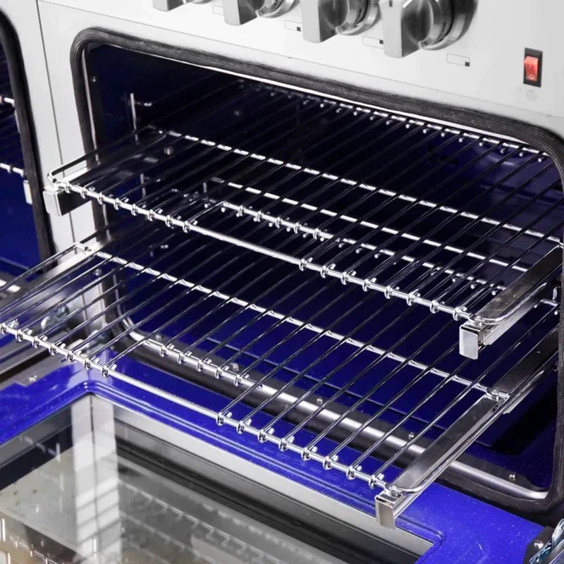 The heavy-duty continuous cast iron grates allow for even heat distribution and maximum stability of cookware mobility over a recessed enamel cooktop cavity which keeps spills and splashes contained and easy to clean. Double electric ovens have a combined 8.64 cu.ft. capacity with a total broil and bake output of 12,600 Watts, encased in blue enamel interiors and sealed with insulated oven doors and tempered 3-layer glass windows. True convection ovens ensure to achieve fast, precision and consistent oven cooking. Included are 2 telescopic oven racks, concave Wok Ring, 2 reversible grill/griddle, Air Fryer basket, rack & drip pan, LP conversion kit and 4-prong power cord. Housed in a high-grade stainless steel body and zinc coated metal knobs with bezels.