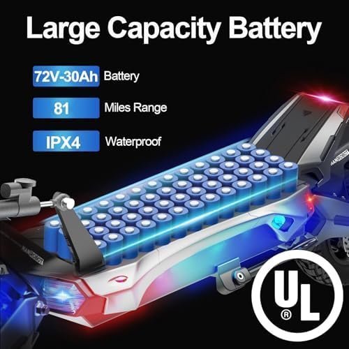 - 【72V30AH Large Capacity Lithium Battery】Fast Electric scooter has a single-drive range of 130 km/80 miles per charge, and a dual-drive range of 60-70 km/37-43 miles, longer driving distance and longer service life.