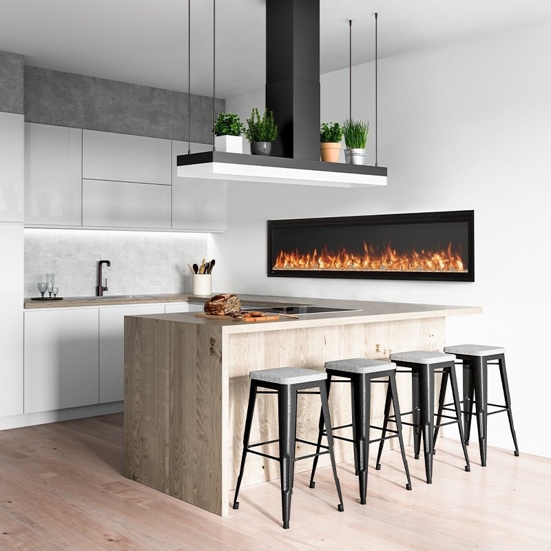 Control is paramount with the Entice 60″. The included remote puts you in command of every aspect of the fireplace. Adjust flame intensity, colors, and ember bed hues while enjoying the peace of mind that no gas fitter is required for installation—simply hang on your chosen wall, plug in, and be captivated. Designed with a shallow profile, it claims minimal space, providing warmth and charm without dominating your living area. For those with a penchant for seamless integration, it offers options to be fully or partially recessed. This aesthetic marvel, bordered with a nearly invisible frame, ensures the focus remains on the vibrant display of the fireplace itself, making the Napoleon Entice 60″ Wall-Hanging Linear Electric Fireplace a luxurious addition to any modern home.