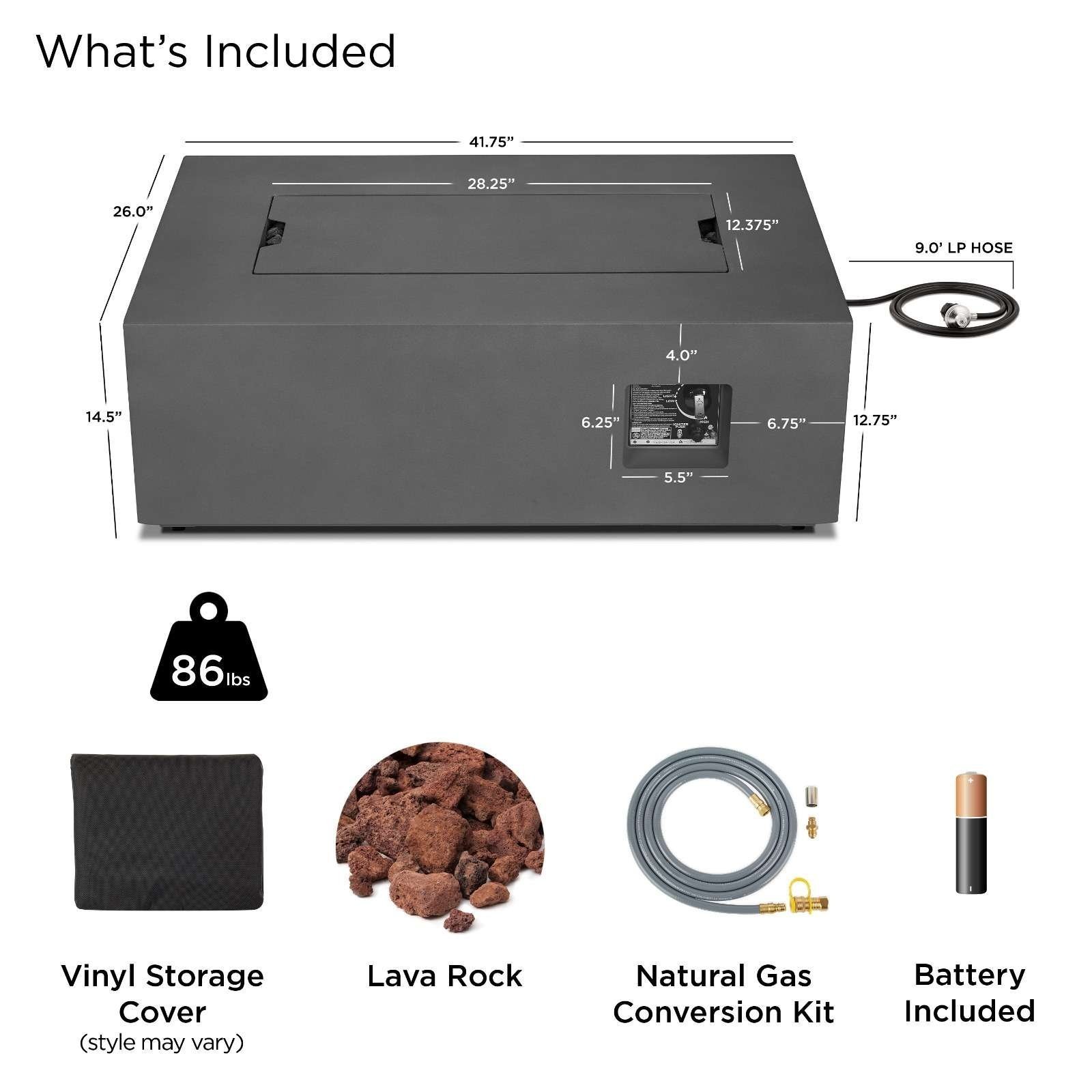 - Includes fire table with leveling feet, 23″ linear stainless steel burner, burner lid, lava rock filler, storage cover, AAA battery, tank seat, touch up paint for mist gray and weathered slate finish, 9’LP hose with regulator and natural gas conversion kit with 10′ NG hose and quick connect socket