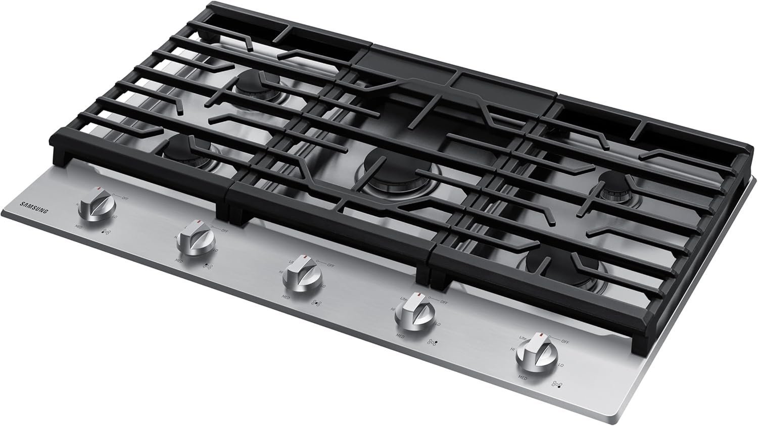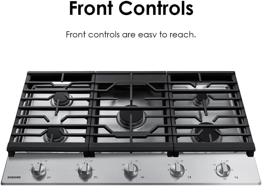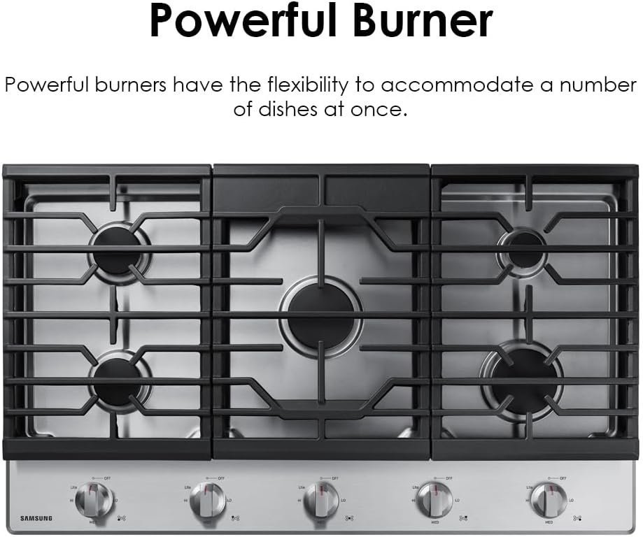 SAMSUNG 36″ Built In Gas Cooktop with 5 Burners, Stainless Steel, NA36R5310FS/AA. From quickly boiling water to maintaining a simmer, this innovative cooktop features powerful burners to accommodate a number of dishes at once.