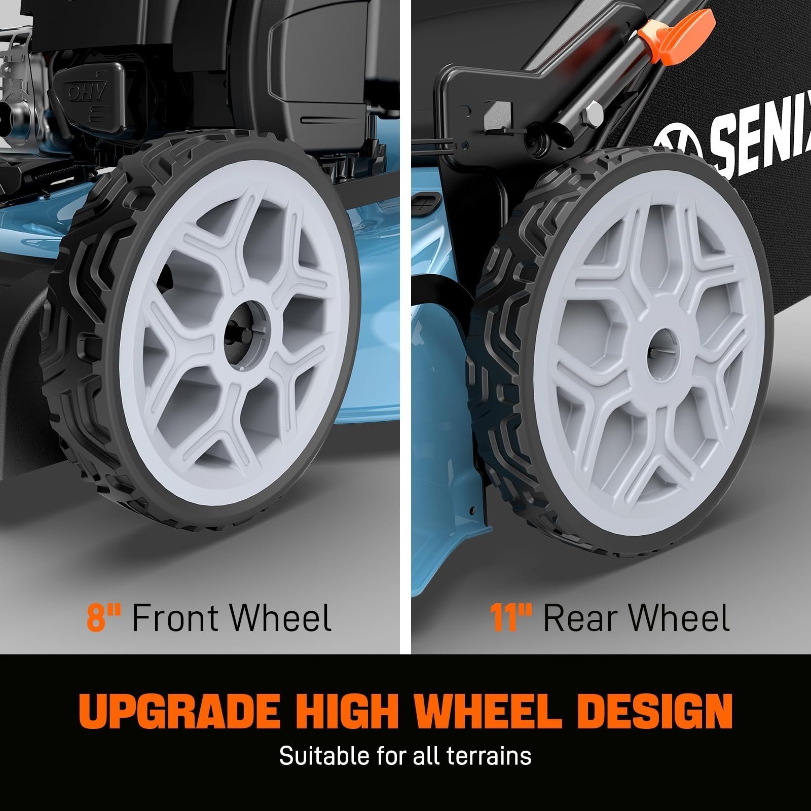 Details: Beautify your lawn with the SENIX 22-inch 163 cc self propelled lawn mower. This rear-wheel drive, variable speed self-propelled lawn mower features a 22-inch steel deck and is powered by a reliable Briggs & Stratton 163 cc gas powered engine that is designed to provide longer engine life, low vibration, and easy maintenance. The 4-stroke engine is eco-friendly offering low emissions, low fuel consumption, no mixing of oil and gas, and low noise. Auto choke start makes it easy to start the mower every time, and the 3-in-1 convertible deck allows you to mulch, side discharge, or rear bag grass clippings with our 19 gallon grass bag. This lawn mower is ideal for small to medium size yards. The durable 8-inch front and 11-inch rear wheels provide great maneuverability through rough terrain and uneven surfaces, can be adjusted to 6 different positions from 1.25-inches to 4-inches using a dual-lever to meet the needs and conditions of your lawn. Vertical storage saves up to 70% storage space with no fuel or oil leaks. All SENIX lawn mowers are backed by our 2-year limited warranty for your peace of mind.