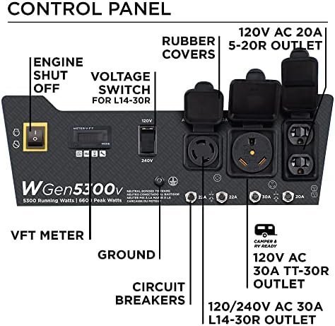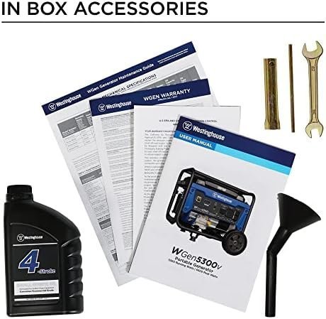 Brand Westinghouse Wattage 6600 watts Fuel Type Gasoline Power Source Fuel Powered Recommended Uses For Product Residential Item Weight 142 Pounds Voltage 240 Volts Output Wattage 6600 Special Feature Automatic Voltage Regulation, Fuel Gauge, Hour Meter, Muffler Included Components Assembly Wrench, Engine Oil & Funnel, Owner’s Manual, Quick-Start Guide, Warranty Color RV and Transfer Switch Ready Product Dimensions 26.7″L x 21.6″W x 20.3″H Model Name Open Frame Generators Engine Type 4 Stroke Ignition System Type recoil start Tank Volume 4.7 Gallons Engine Displacement 274 Cubic Centimeters Runtime 14 hours Total Power Outlets 4 Frequency 60 Hz Engine Power Maximum 6.6 Kilowatts Starting Wattage 6600 Watts Running Wattage 5300 Watts UPC 853544008953 Manufacturer Westinghouse Global Trade Identification Number 00853544008953 Part Number 5301 Item Weight 142 pounds Item model number WGen5300v Style 6600W Pattern Generator Item Package Quantity 1 Sound Level 68 dB Handle/Lever Placement Front Special Features Automatic Voltage Regulation, Fuel Gauge, Hour Meter, Muffler Batteries Included? No Batteries Required? No Warranty Description 3 Year Limited Warranty